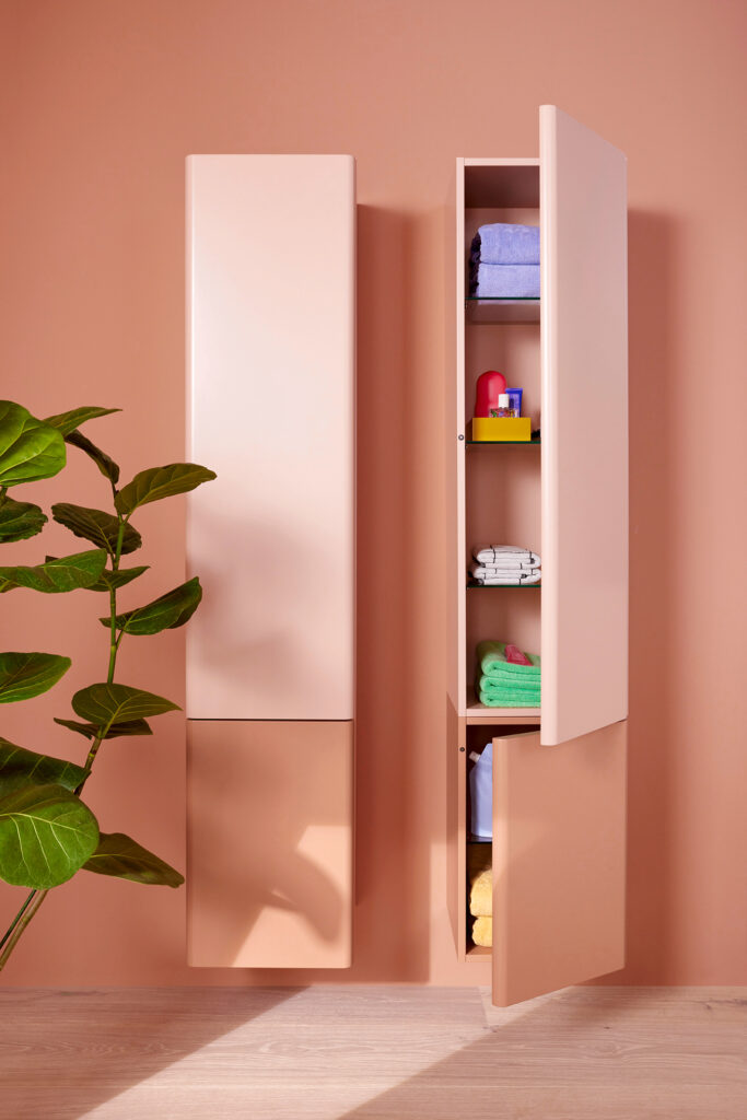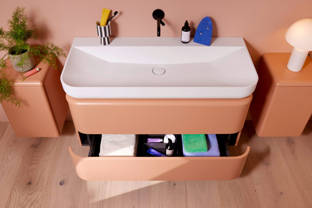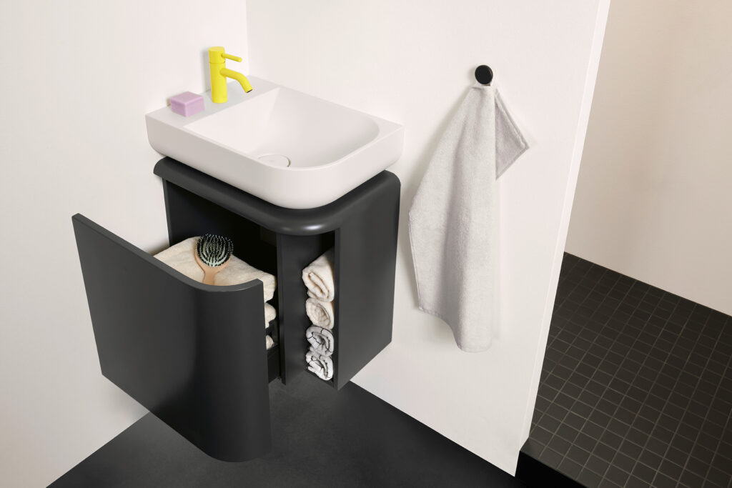 Entstanden ist eine Lack-Kollektion mit Rundfronten von höchster handwerklicher Qualität. Die Farbpalette entspricht dabei ganz dem Gefühl des Studios Besau-Marguerre für zeitgenössisches Interior Design und ist komplett individualisierbar. Zudem bietet sich die komfortabel gestaltete Gästebad-Ecklösung auch als architektonisch reizvolle Option für Kleinbäder im Tiny House-Stil an.