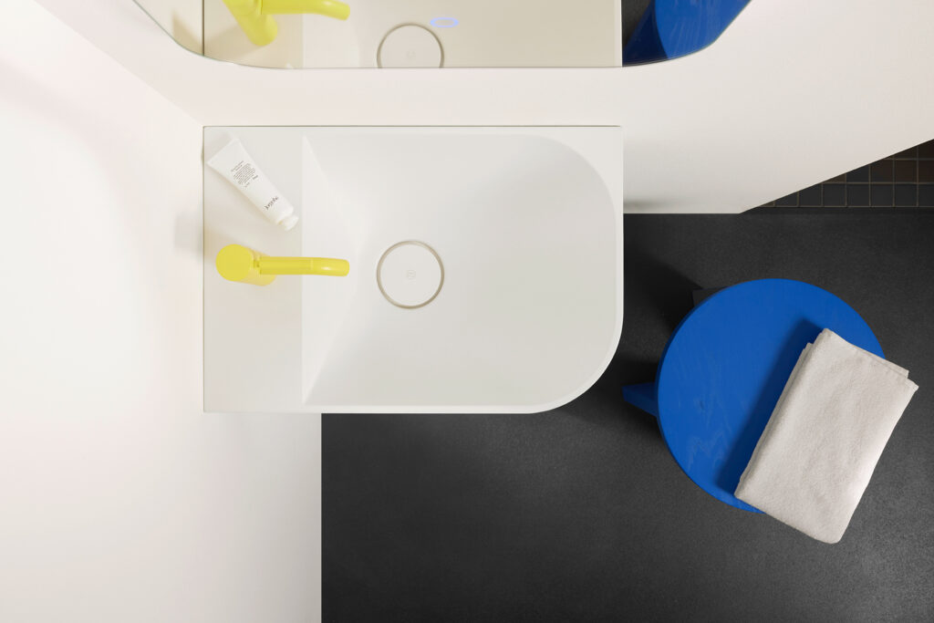 In erster Linie ist b:me aber durch den architektonischen Charakter und eine fast klassische Eleganz definiert. Schon der Waschtisch selbst kombiniert organische Formen mit geometrischer Klarheit. Die spitz auf den Ablauf zulaufenden Kanten bilden einen spannungsvollen Kontrast zur soft ausgeformten Beckenmulde. „Formal haben wir uns dem Mineralguss-Waschtisch über die Ästhetik eines nur partiell gefalteten Papiers genähert, dessen scharfe Kanten in weiche Rundungen übergehen“, verrät Designer Marcel Besau. „Die Form wird vor allem durch Licht und Schatten moduliert und verbindet die weichen und gewölbten Flächen von Sanddünen mit einer klaren Kantenführung.“